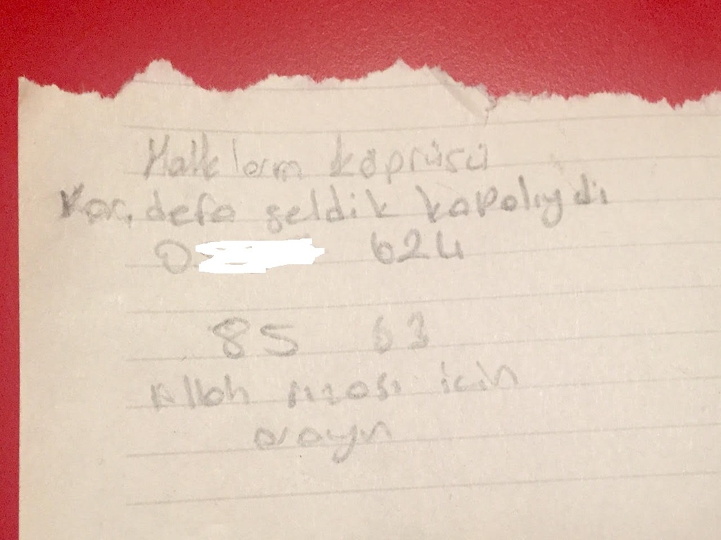 unnamedHalkların Köprüsü Derneği kapısına ” geldik bulamadık, Allah rızası için …. telefon numarasını arayın” şeklinde bırakılan not üzerine aynı gün verilen numara arandı ve ilgili Suriyeli aileye ulaşıldı.